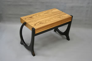縞模様の木目が特徴のゼブラウッドが天板部分に、焦げ茶に染色した5センチ厚のオーク材が脚部に使われています。